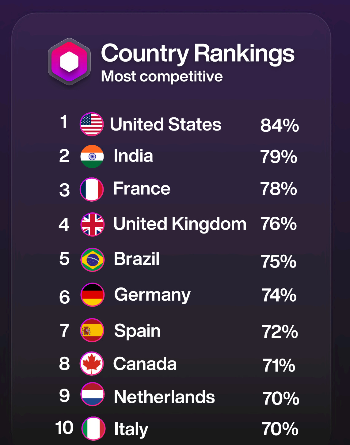 The United States remains the most competitive country on LinkedIn, with a competitiveness level of 84%.